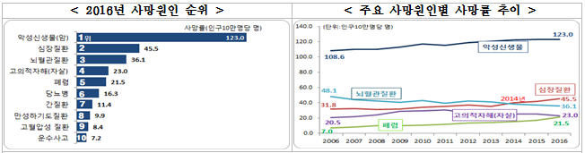 2016년 암 사망률(인구 10만 명당 명)은 123.0명이고, 암 종류별로 보면 폐암(사망률 26.9명)이 가장 높았고, 간암(16.7명), 대장암(14.1명), 위암(12.9명), 췌장암(9.1명)이 뒤를 이었다. 10년전 대비 폐암 사망률은 3.6명(15.5%), 대장암은 3.0명(27.0%), 췌장암은 3.6명(65.5%) 증가한 반면, 위암 사망률은 4.8명(-27.1%) 감소했다.