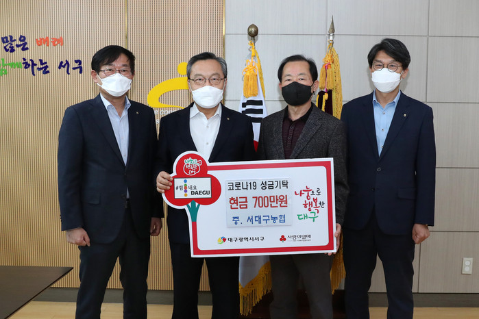 [로컬세계 박세환 기자]서대구농업협동조합 이윤영 조합장과 손익수 상임이사는 9일 서구청을 방문해 코로나19로 어려움을 겪고 있는 분들에게 따뜻한 위로의 말을 전하며 성금 700만원을 전달했다.