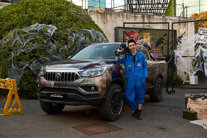 ▲서울 성수동 어반소스 현장에 전시된 렉스턴 스포츠 칸 좀비카 옆에서 좀비 모델이 포즈를 취하고 있다. |