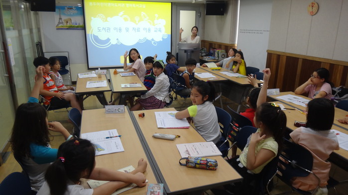 ▲동대문구 용두어린이영어도서관에서 초등학생들이 도서관 이용 교육을 받고 있다.(동대문구 제공) |