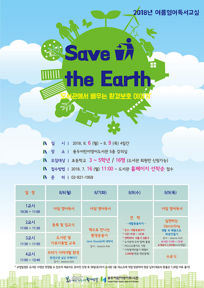 참가자들의 영어 능력 향상과 도서관 이용의 활성화를 위해 마련된 이번 프로그램은 ‘Save the Earth’라는 주제로 8월 6~9일까지 4일간 진행된다. 프로그램은 △영어 독서 및 독후감 쓰기 △환경보호 수업 △서울새활용플라자 견학 등이 있다.