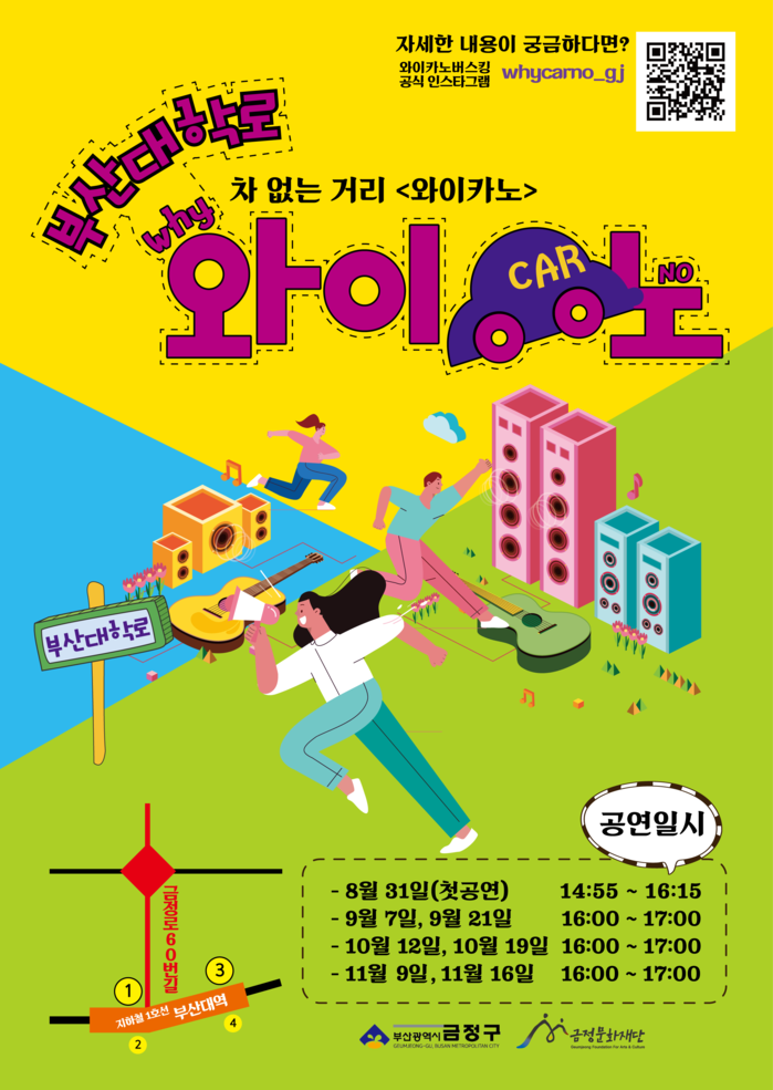 정미영 금정구청장은 “부산대 일원 ‘와이카노(Why car no?) 버스킹’ 공연이 사람이 중심이 되는 차 없는 거리의 기반이 될 것”이라며 “침체된 대학로를 활성화 시키고 지역의 문화명소로 거듭날 수 있는 기회를 마련할 것으로 기대한다”고 말했다.