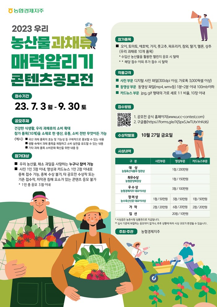 농협경제지주는 오는 9월 30일까지 '2023 우리 농산물 과채류 매력 알리기 콘텐츠' 공모전을 개최한다.