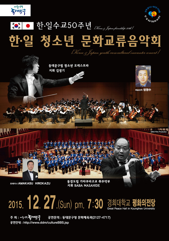 동대문구는 구립청소년오케스트라와 동경도립 가타쿠라고교 취주악부가 오는 27일 경희대학교 평화의전당에서 한·일 문화교류음악회를 개최한다고 22일 밝혔다.