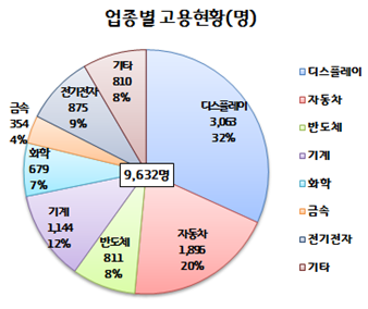 고용 역시 디스플레이가 3063명으로 31.8%, 자동차가 1896명으로 19.7%, 두 업종이 전체 고용의 51.5%를 차지했다.