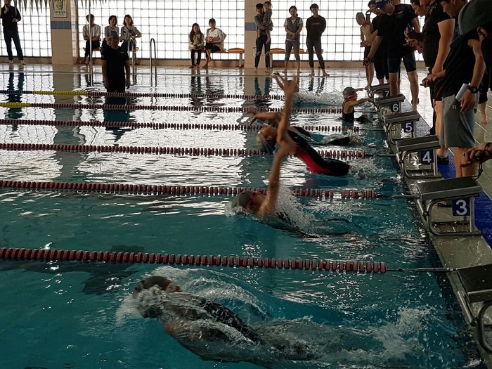 ▲초등 3학년 여학생들이 배영 50m 스타트를 하고 있다. |