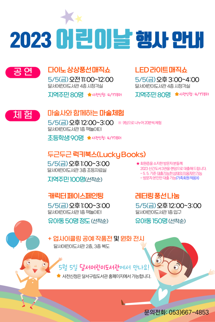 이번 행사는 5월 5일 오전 11시부터 달서어린이도서관에서 진행될 예정이며, 프로그램 사전신청 및 자세한 내용은 달서구립도서관 홈페이지에서 확인 가능하다.
