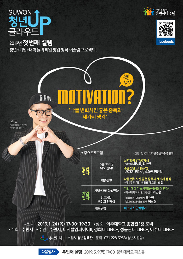 행사 참여를 원하는 청년들은 22일까지 수원시 홈페이지(www.suwon.go.kr)에서 ‘2019 청년UP 클라우드’ 참여자 모집 배너를 클릭해 네이버 서식(http://bit.ly/수원청년업클라우드)으로 제출하면 된다.