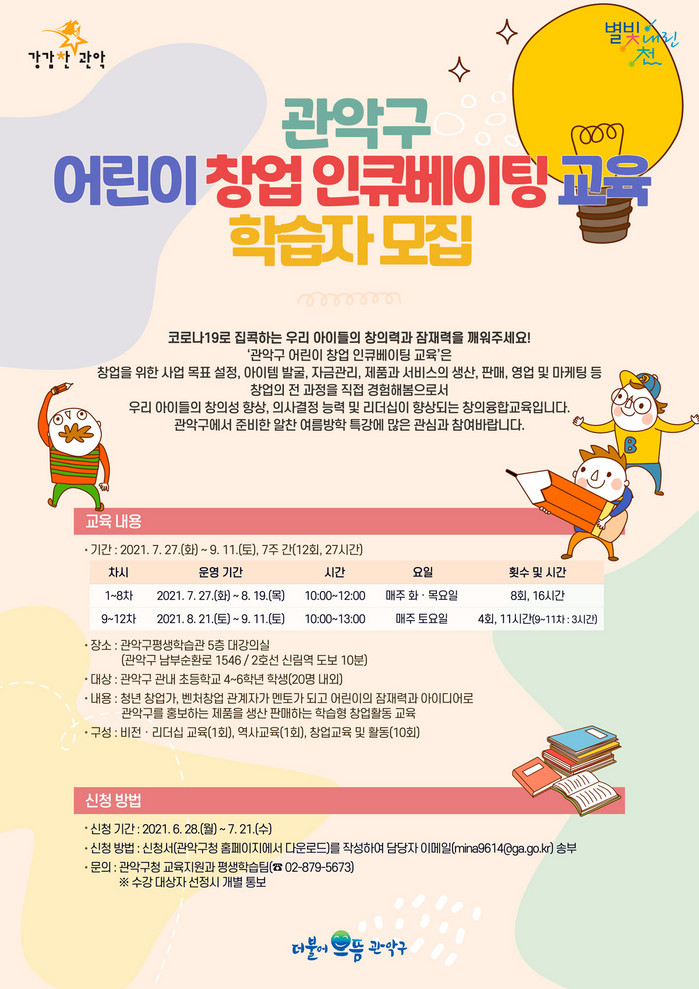 [로컬세계 임종환 기자]서울 관악구는 코로나19로 다양한 체험활동 및 진로개발에 어려움을 겪고 있는 지역 내 학생들을 대상으로 ‘어린이 창업 인큐베이팅 교육’을 진행한다고 1일 밝혔다.