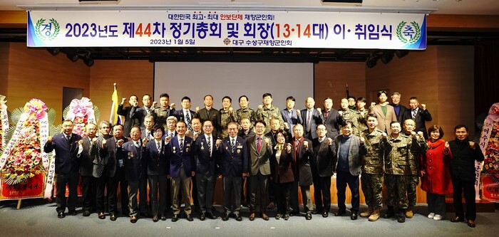 ▲ 대구 수성구재향군인회(회장 김후찬)는 지난 5일 범어도서관에서 제44차 정기총회 및 회장 이취임식을 개최 후 기념 촬영하고 있다. |