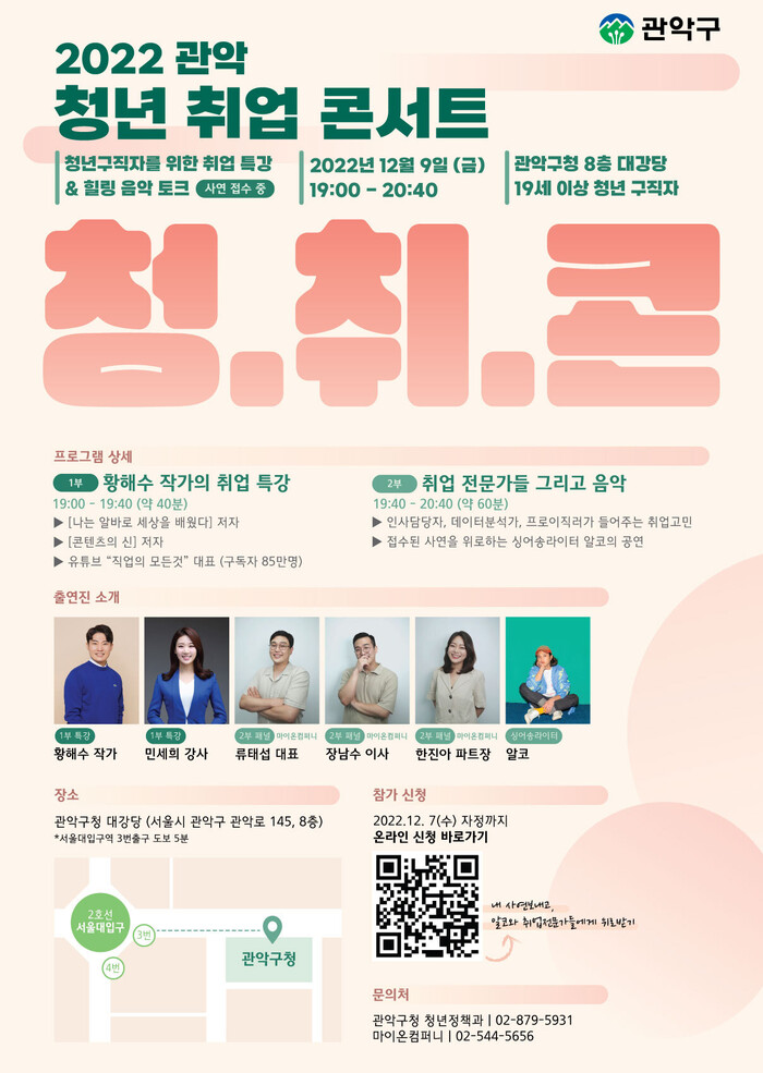 [로컬세계 = 임종환 기자]서울 관악구(구청장 박준희)가 오는 9일 오후 7시 관악구청 대강당에서 ‘2022. 관악 청년 취업콘서트’를 개최한다.