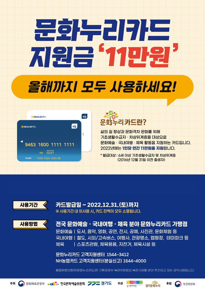 시 관계자는 “2022년 문화누리카드 지원금액이 총 11만원으로 증가한 만큼, 지원금이 소멸되지 않도록 꼭 사용하여 주시길 바란다”라고 밝혔다.