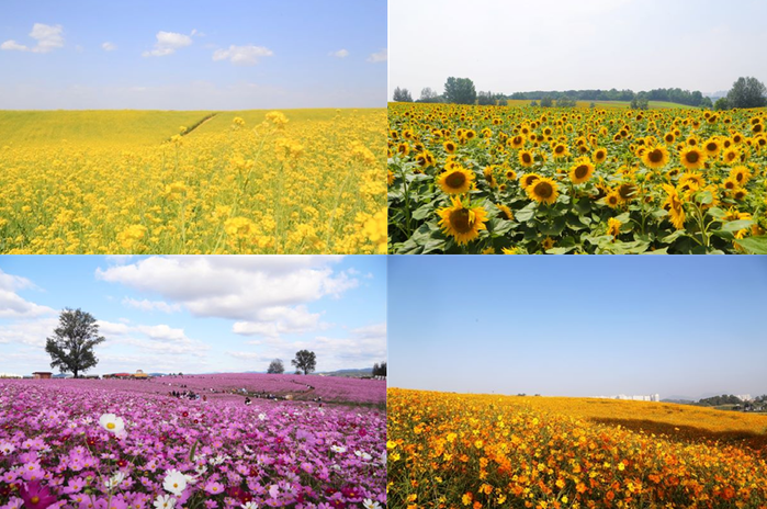 ▲ 팜랜드 계절별 경관사진 봄(유채꽃밭), 여름(해바라기밭), 가을(코스모스, 황하) / 농협 제공 |