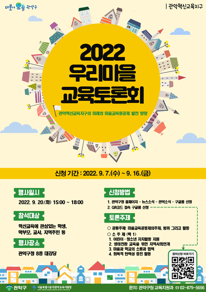 [로컬세계 = 임종환 기자]서울 관악구는 지난 8년간의 관악혁신교육지구 활동을 공유하고, 마을교육공동체의 발전 방향을 모색하고자 오는 20일 ‘2022 우리마을 교육토론회’를 개최한다.