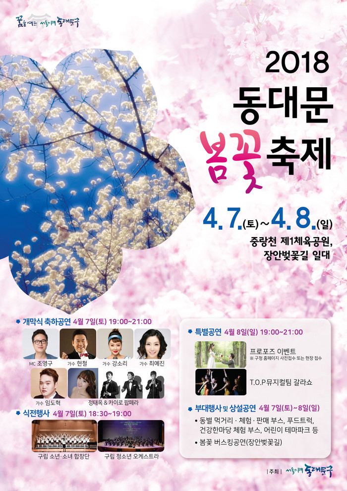 동대문 봄꽃축제의 개막행사는 7일 저녁 7시에 시작한다. 방송인 조영구의 사회로 식전행사 및 초대가수 현철, 강소미 등의 축하공연이 진행되며, 동대문구 홍보대사 배우 김보성도 무대를 함께한다.