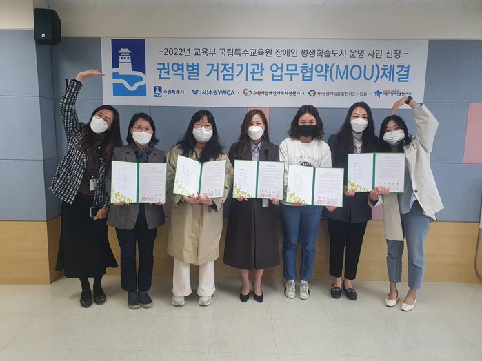 | ▲수원시가 지난 3월31일 2022년 장애인 평생학습도시 운영 사업을 함께 추진할 4개 거점기관과 업무협약을 체결한 뒤 관계자들이 기념촬영을 하고 있다. 수원시 제공 |