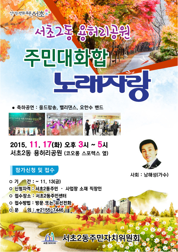 서초구 서초2동은 17일 오후3시부터 용허리공원에서 ‘용허리공원 주민대화합 노래자랑’ 대회를 개최한다고 밝혔다.