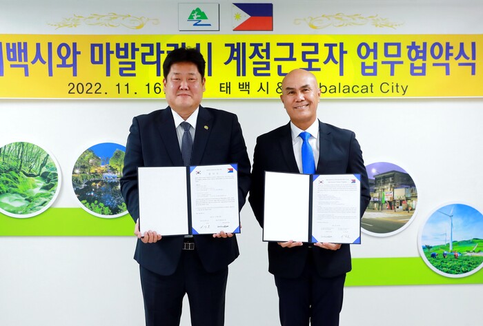 [로컬세계=박상진 기자]강원 태백시는 농촌노동력 부족 해결을 위해 지난 16일 태백시장 집무실에서 필리핀 팜팡가주 마발라캇시와 외국인 계절근로자 교류에 관한 양해각서 협약(MOU)을 체결했다고 17일 밝혔다.