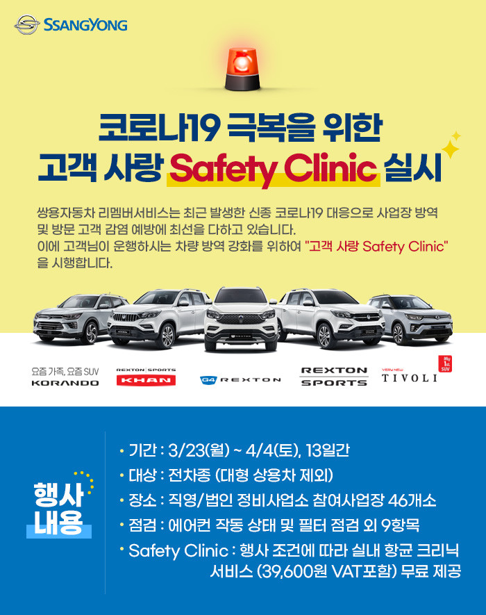 ▲쌍용자동차가 코로나19 예방 캠페인 일환으로 전국 서비스센터 및 법인 정비사업소 등 46개소에서 오는 4월 4일(토)까지 2주간 전 차종(대형 상용차 제외)을 대상으로 ‘고객 사랑 Safety Clinic 차량점검 서비스’를 시행한다. |