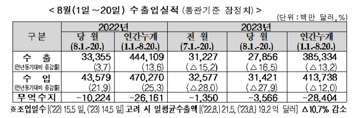 관세청은 8월 1~20일 기간 수출이 279억 달러로 작년 같은 기간보다 △16.5%(55억 달러↓) 줄었다고 21일 밝혔다.