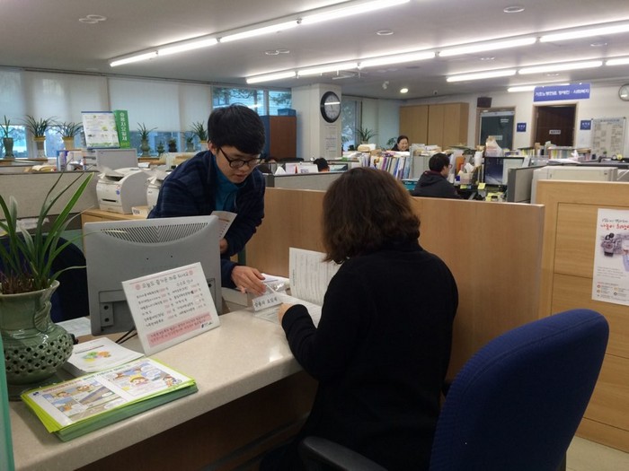 ▲겨울방학을 맞아 강남구청에서 행정체험 연수 중인 한 대학생이 민원업무를 보고 있다. |