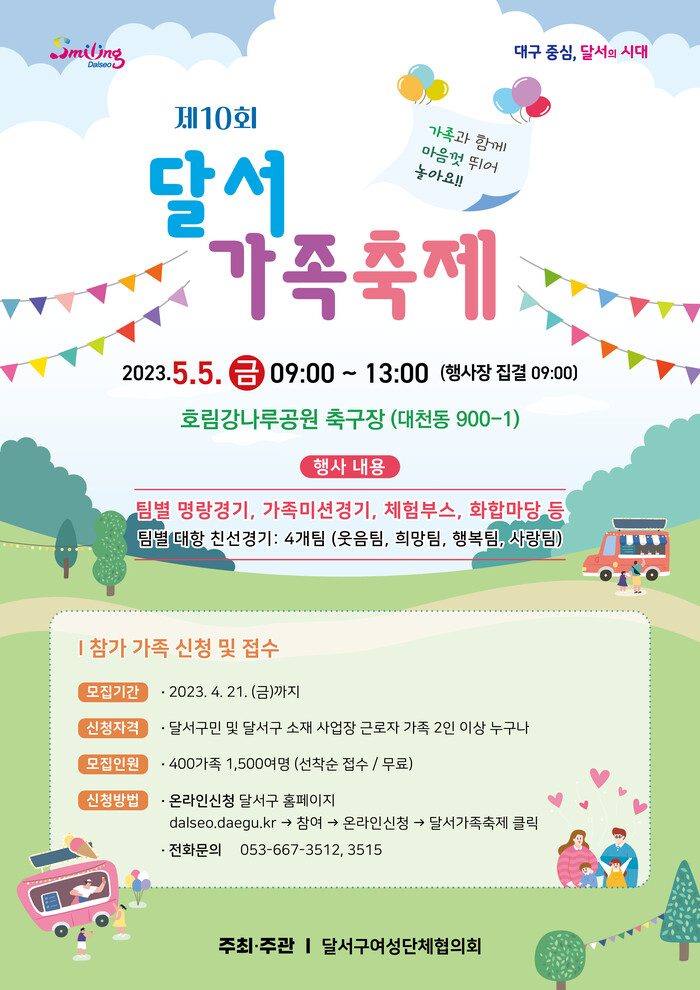 올해 10회째를 맞는 달서가족축제는 다양한 가족과 이웃이 함께 따뜻한 공동체 문화를 조성하기 위해 마련됐으며, 5월 5일 오전 9시 호림강나루공원 축구장에서 개최된다.