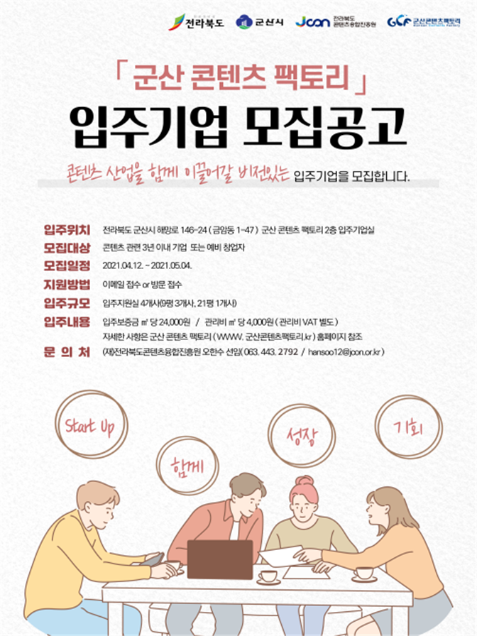 자세한 내용은 군산콘텐츠팩토리 홈페이지를 참고하거나 (재)전라북도콘텐츠융합진흥원으로 문의하면 된다.
