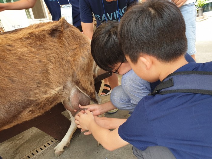 ▲충청남도 청양군에 방문한 어린이 문화체험단 단원들이 지난 8월 1일 용 꿈꾸는 마을에서 산양유 짜기 체험을 하고 있다. |
