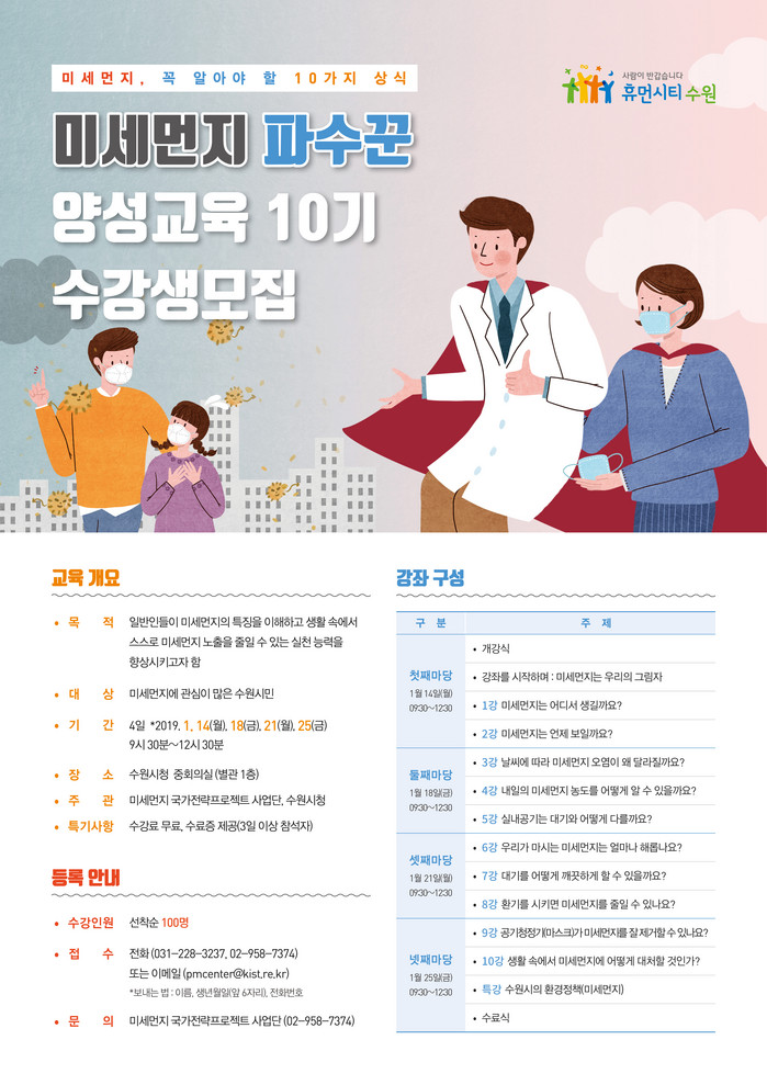 수원시가 주관하고 미세먼지 국가전략프로젝트 사업단이 주최하는 이번 교육은 시민들에게 미세먼지의 특성을 알리고 대응 방법을 알리는 프로그램이다.