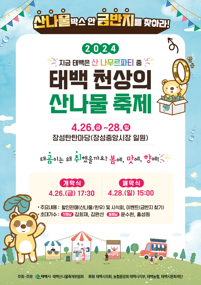 시 관계자는 “사계절 축제 도시 태백의 대표 봄축제인 천상의 산나물 축제에 온 가족이 함께 참여하여 봄을 만끽하시기 바라며, 안전하고 즐거운 축제가 될 수 있도록 최선을 다하겠다”고 전했다.