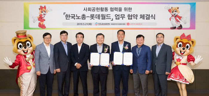 ▲21일 롯데월드 박동기 대표이사(왼쪽에서 네번째) 와 한국노동조합총연맹 김주영 위원장(왼쪽에서 다섯번째) 이 외국인근로자, 다문화가족 등 사회적 취약계층의 여가활동 지원을 위한 업무협약을 체결하고 기념사진을 촬영하고 있다.(롯데월드 제공) |