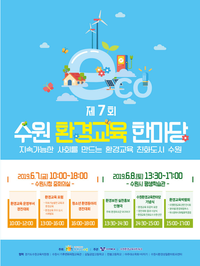 8일에는 팔달구 수원시평생학습관에서 환경보전 실천홍보 인형극 ‘환경파괴군 마구마구’가 상연되고, 수원환경교육 전시회·환경체험부스 등을 체험할 수 있는 ‘환경교육 박람회’가 열린다. 박람회 참가자에게는 친환경 EM 발효액(친환경 세제)을 증정한다.