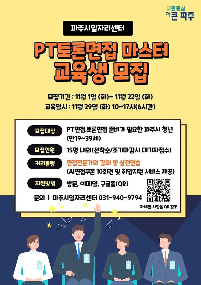 [로컬세계 = 이영원 기자]경기 파주시는 11월 1일부터 22일까지 ’PT·토론 면접 마스터 프로그램‘의 참여자 15명을 선착순으로 모집한다.