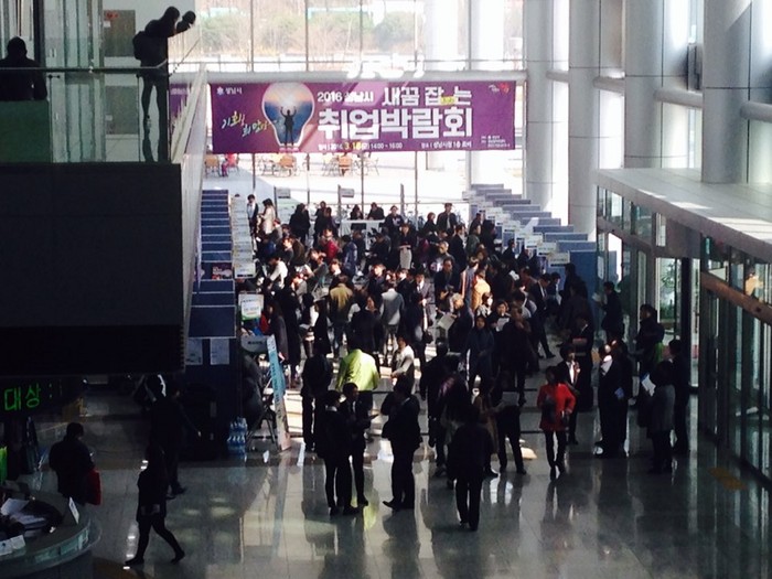 | ▲성남시청에서 열린 취업박람회에 구직자들이 각 업체 부스에서 현장면접을 보고 있다. |