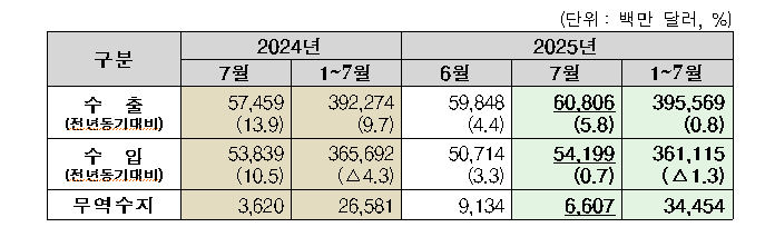 [로컬세계 = 최종욱 기자]관세청이 18일 발표한 2025년 7월 수출입 동향 확정치에 따르면, 수출은 전년 같은 달보다 5.8% 늘어난 608억 달러로 집계됐다. 수입은 0.7% 증가한 542억 달러였으며, 무역수지는 66억 달러 흑자를 기록하며 6개월 연속 흑자 기조를 이어갔다.