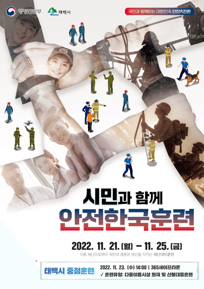오는 23일 오후 2시에는 365세이프타운에서 시 관내 13개 기관 및 단체 200여 명과 공모에 의해 선발된 국민체험단이 현장훈련을 실시하여 시 관내 유관기관과의 재난대응 체계를 점검하는 훈련을 실시한다.