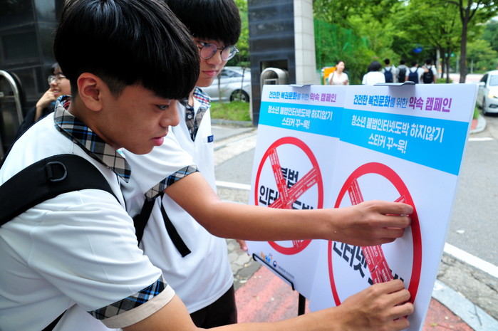 기획재정부 복권위원회와 동행복권이 실시한 건전한 복권문화 캠페인에서 서울시 송파구 소재 고등학교 앞 하교하는 학생들이 청소년불법인터넷도박 근절 스티커를 부착하고 있다.