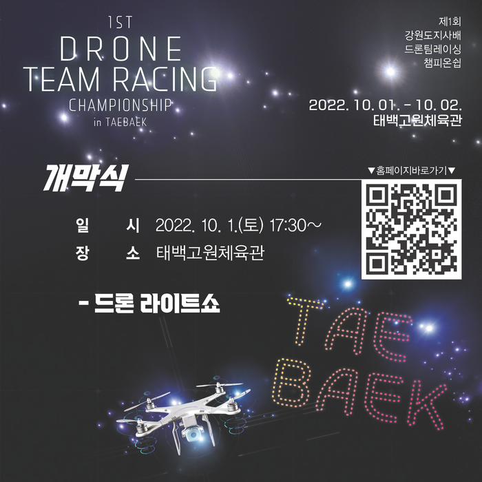 [로컬세계=박상진 기자]강원 태백시는 ‘강원도민과 함께 두런두런(Do Run Drone)’ 이라는 주제로 오는 10월 1일부터 2일까지 양일간 태백 고원체육관 및 종합경기장에서 '제1회 강원도지사배 드론스포츠대회'를 개최한다.