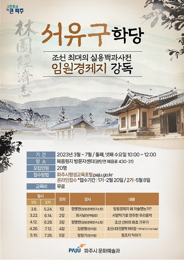 [로컬세계 = 이영원 기자]경기 파주시는 오는 3월부터 7월까지 격주 수요일 혜음원지 방문자센터에서 2023년 임원경제지 학교의 첫 번째 프로그램인 ‘서유구 학당’을 운영한다고 28일 밝혔다.