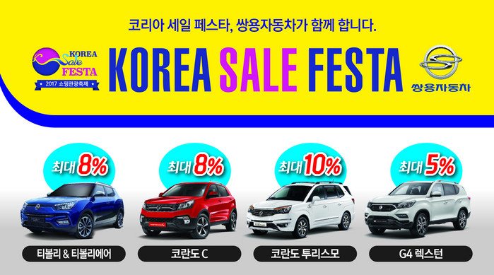 쌍용자동차가 글로벌 쇼핑관광축제인 ‘2017 코리아세일페스타’에 동참하며, 티볼리 아머와 G4 렉스턴을 비롯한 인기 모델을 대상으로 파격적인 할인을 실시한다고 28일 밝혔다.