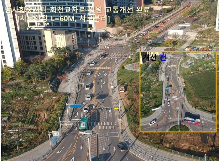 이에 구는 기존 1차선 도로 60m 구간을 2차선으로 확장하고, 직진 차량과 우회전 차량의 통행 차로를 분리해 사고위험을 줄이고, 상습정체를 해소했다.