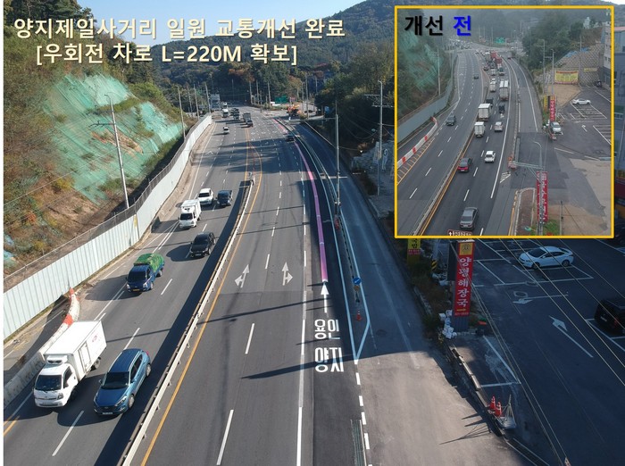 구는 양지IC~양지파인리조트 방면의 우회전 차선이 바로 이어지도록 2차로 감소 220m 구간에 설치된 철제 가드레일과 표지판, 빗물받이 배수로 등을 도로 가장자리로 이설, 병목현상을 해결했다.