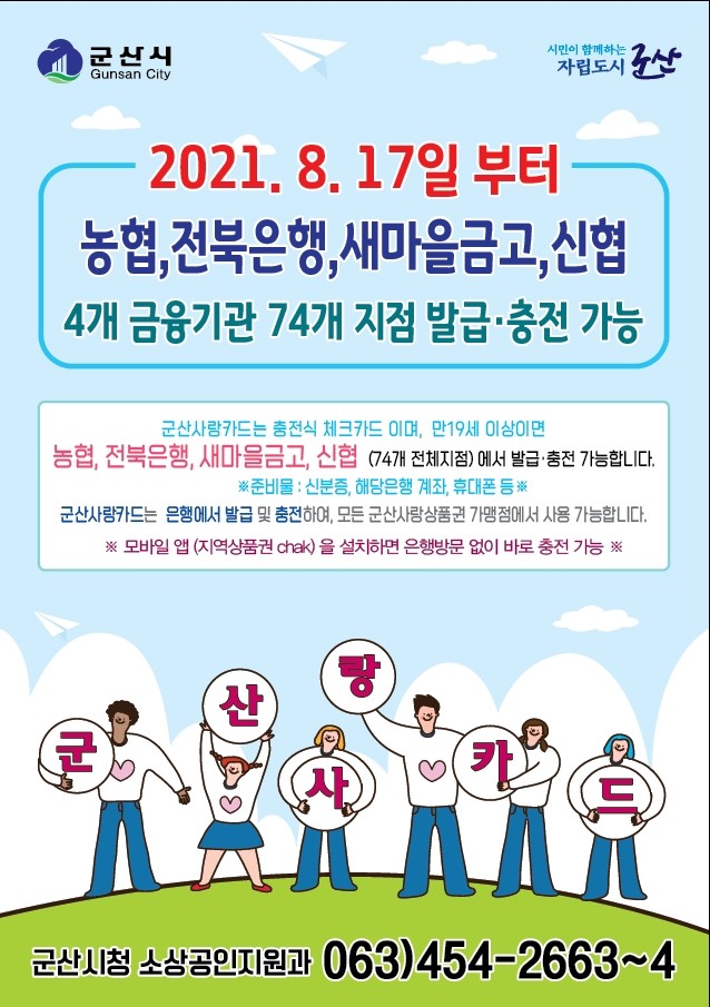 [로컬세계 양해수 기자]전북 군산시는 군산사랑상품권을 카드처럼 사용할 수 있는 '군산사랑카드'가 오는 17일부터 4개 금융기관 74개 전체지점에서 발급 및 충전이 가능하다고 12일 밝혔다.