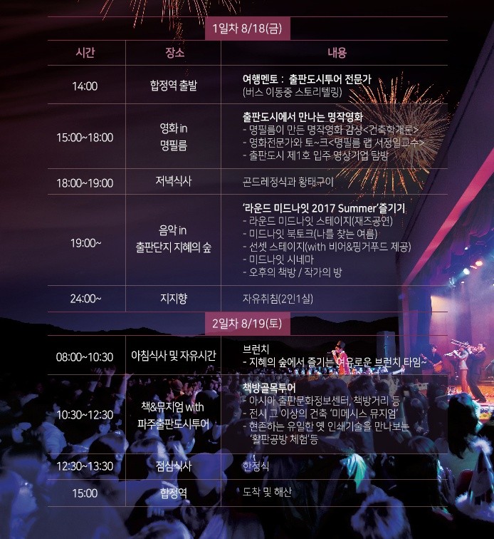 프로그램 참가자들은 18일 오후 합정역에서 버스를 타고 출발, 파주출판도시 일대에서 다양한 문화체험활동을 밤새 할 수 있다.