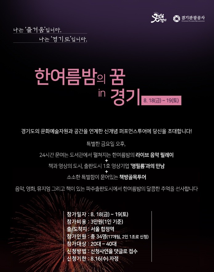 15일 경기도에 따르면 오는 18일 저녁부터 19일 정오까지 이틀에 걸쳐 파주출판단지에서 ‘한여름밤의 꿈 in 경기’ 프로그램을 진행하기로 하고 16일 자정까지 참가자를 모집한다고 밝혔다.