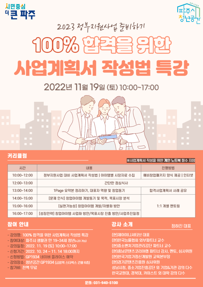 [로컬세계 = 이영원 기자]경기 파주시는 11월 19일 파주시 청년공간 ‘GP1934’에서 사업계획서 작성법 특강을 진행한다.