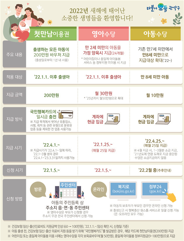 [로컬세계 임종환 기자]서울 관악구(구청장 박준희)가 2022년부터 태어나는 모든 신생아를 대상으로 첫만남이용권, 영아·아동 수당 등 영유아 관련 지원금을 대폭 신설, 확대한다고 11일 밝혔다.