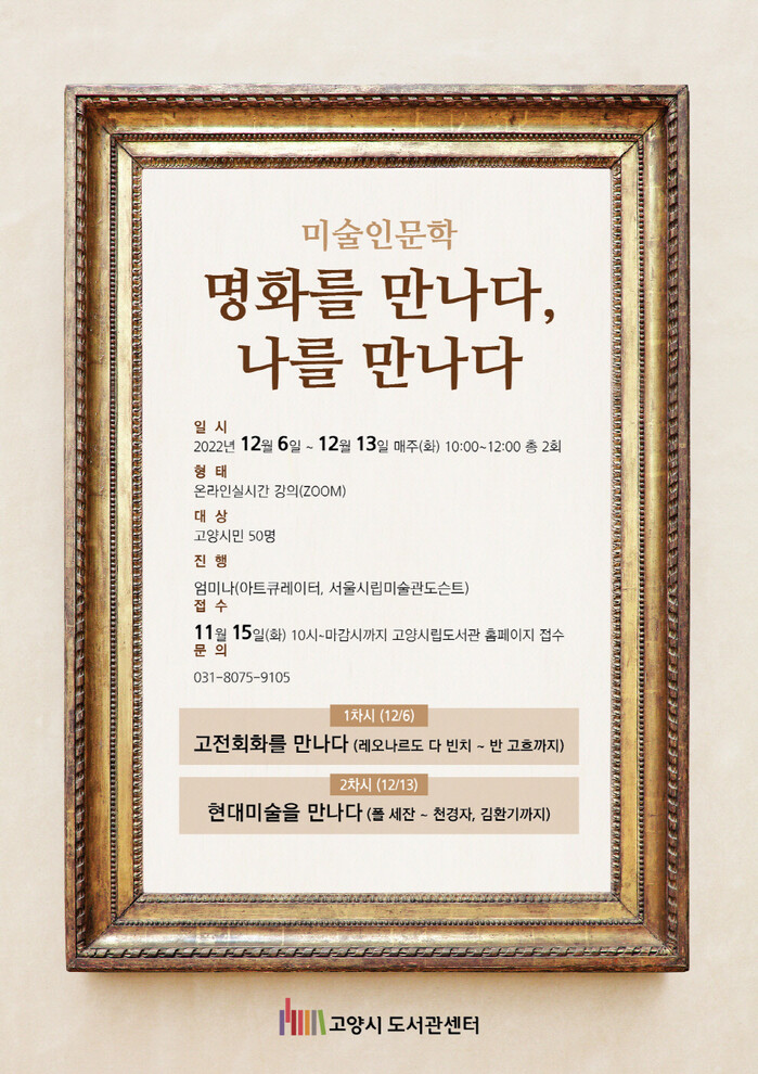 [로컬세계 = 이영원 기자]경기 고양특례시 한뫼도서관이 오는 12월 미술인문학 프로그램 '명화를 만나다, 나를 만나다'를 온라인으로 운영한다고 14일 밝혔다.