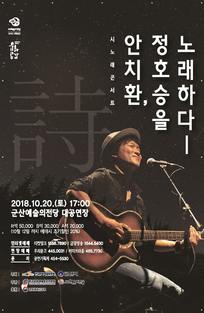 전북 군산예술의전당은 깊어가는 가을을 맞아 아름다운 가사와 음악을 함께 느낄 수 있는 ‘안치환, 정호승을 노래하다’ 콘서트를 오는 20일 오후 5시 군산예술의전당 대공연장에서 개최한다고 16일 밝혔다.