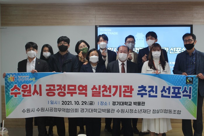 수원시는 최근 경기대학교 박물관, 수원시청소년재단 등 2개 기관의 ‘공정무역 실천기관’ 추진을 이끌었다. 지난 10월 29일 추진 선포식을 한 두 기관은 공정무역 인증을 준비해 내년 공정무역 실천기관 심사를 신청할 예정이다.